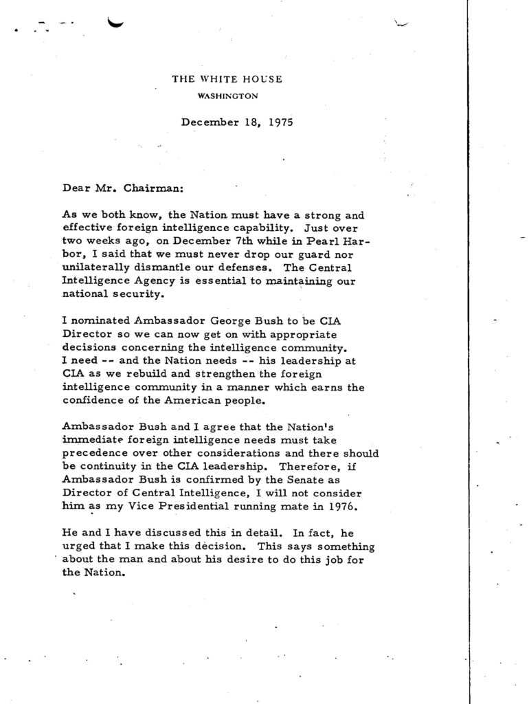 Bush would be taking over the leadership of the CIA at a tumultuous time. The Agency had been the subject of intelligence hearings in the Senate and the House of Representatives, as well as a Presidential Commission. President Nixon reached out to Bush upon the announcement, writing “What you have been through before will look like a cakewalk compared to what you will now be confronted with2.”