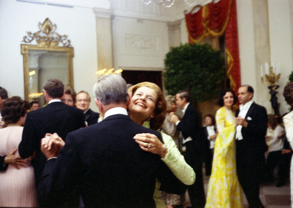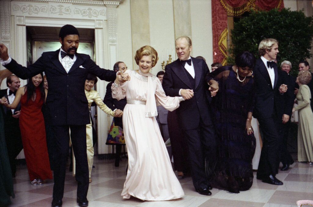 She also busted a move with the President, singer Pearl Bailey, Press Secretary Ron Nessen, and others at the Italian State Dinner in December 1976, dancing the Hustle with instruction provided by Bailey.